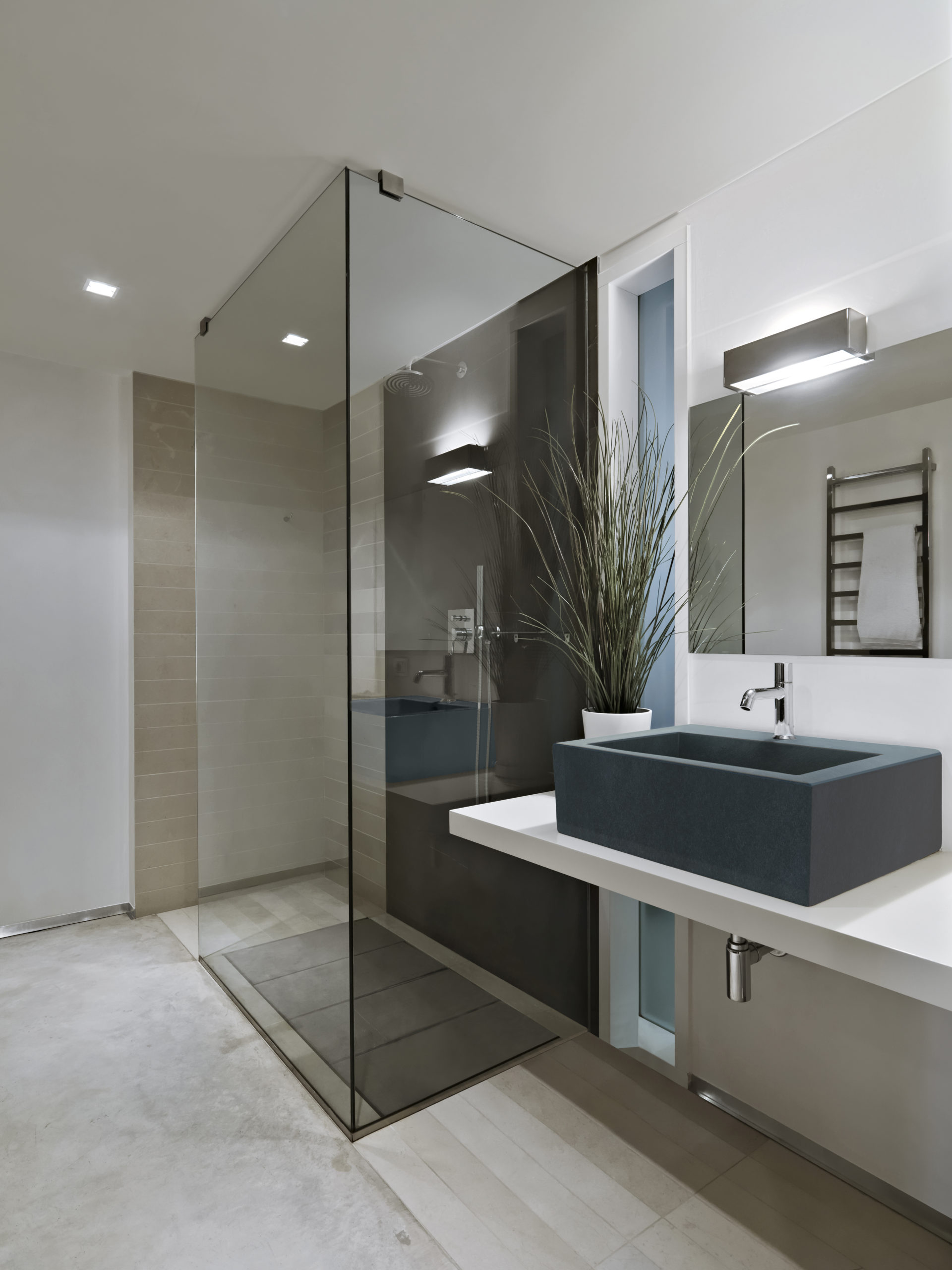 interior shots of a modern bathroom in foreground the countertop washbasin and the glass shower box